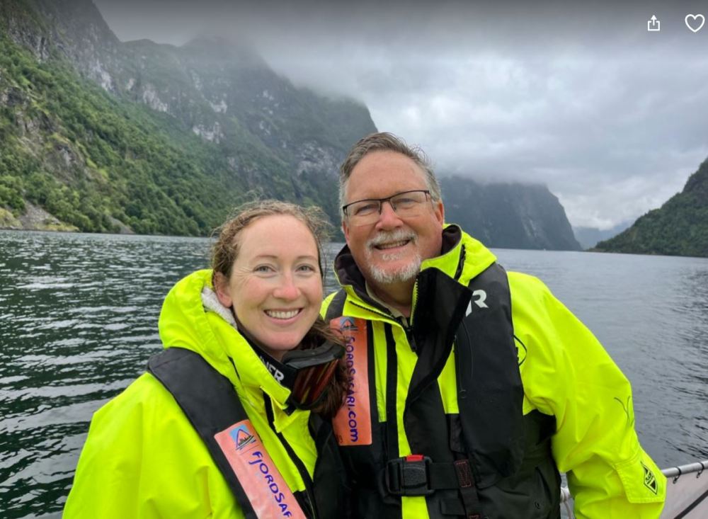 We arrived in Flam and then had to pickup my third daughter who traveled to Flam via bus. We checked into a farmhouse Airbnb above the village of Underdal Norway. The next morning we took a speedboat tour of the fjord leaving from downtown Flam. Pictured below is Cayla and myself in gear to go out on the fjord.