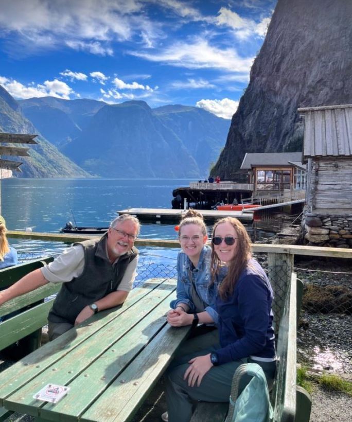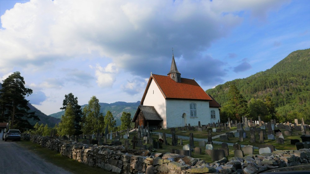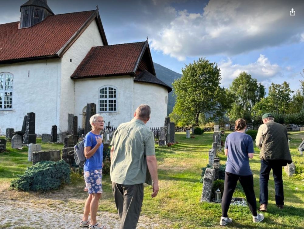 In mid-August of 2022 I traveled to Norway with my three daughters. With the help of some relatives we made arrangements to visit a couple family farms and stay with my cousin’s daughter mother-in-law. We arrived in Oslo and rented a car then drove to a town in western Norway called Seljord. When we arrived at the old church we meet Gjertrud and Kjell. We had lefsa and coffee. Pictured below is Gjertrud, myself, Cayla,and Kjell at the old church.