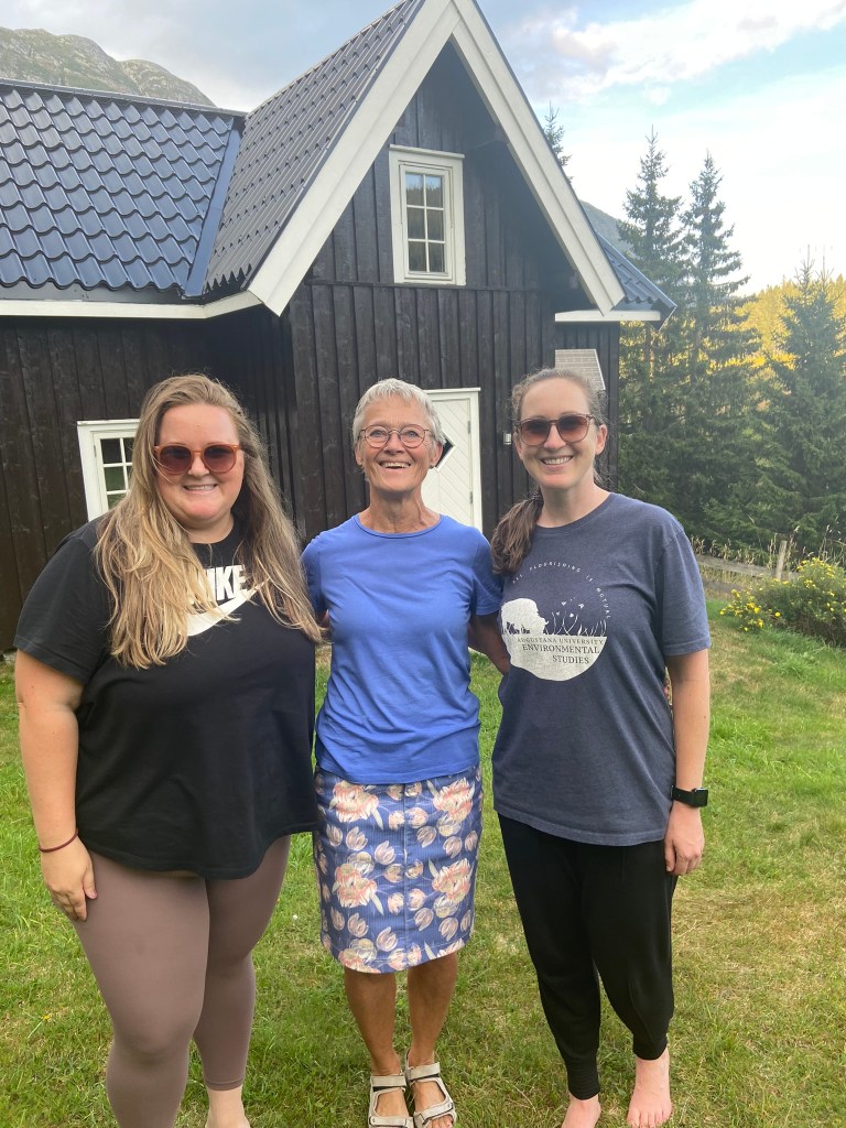 Below, a picture of Amanda, Gjertrud, and Cayla in front of the house.