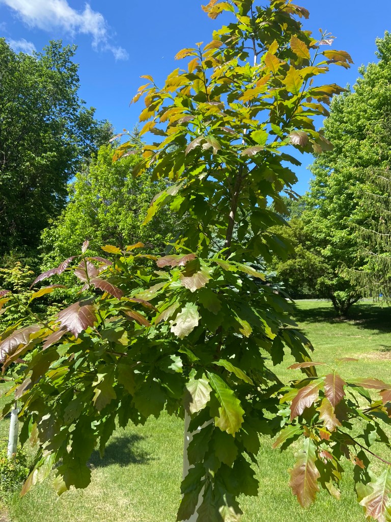The focus of this post is Saul’s oak which is a cross between a chestnut white oak and a white oak. I have purchased Saul’s oaks from Oikos tree crops out of Michigan. Oikos had a lot of very interesting hybrid oaks. However they are no longer selling seedlings. Back to Saul’s oak. Look at the picture below of the great color of the new spring leaves. I would say the color is burgundy red.